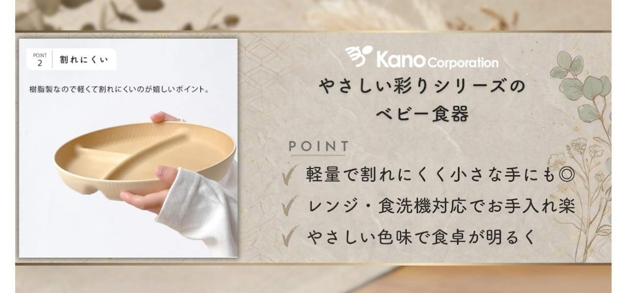 2つめは、子どもと家族の毎日の食事を快適にする日本ブランドのKANO(カノ)です。安全性と機能性、デザイン性を大切にし、離乳食から幼児食期まで長く使えるベビー食器を中心に展開。