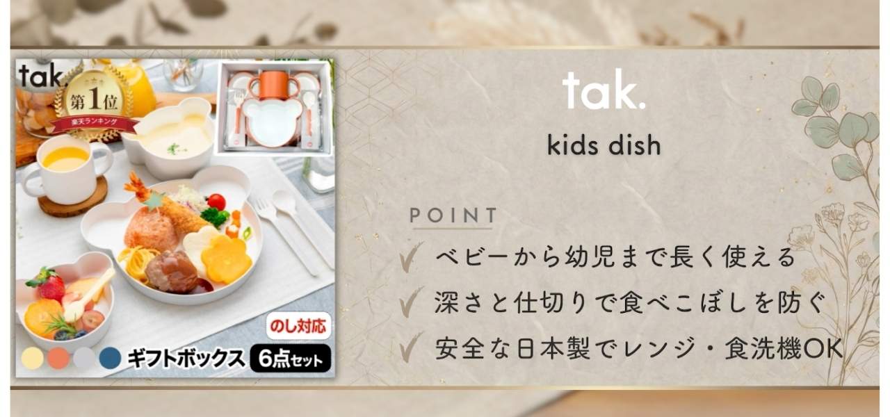 3つめは、暮らしに寄り添うシンプルデザインと機能性を大切にした日本ブランドのtak.です。ベビー・キッズ向けの食器や生活雑貨を中心に、安全性の高い素材と使いやすさを追求。