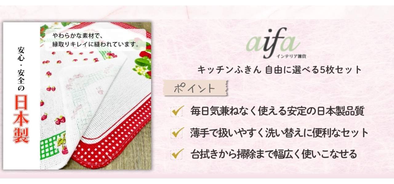 アイファのおすすめアイテムは「キッチンふきん 自由に選べる5枚セット」です。