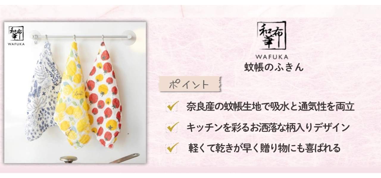 奈良の特産である”かや織”生地を使った日本製ふきんで、蚊帳生地を何枚も重ねて仕立てられています。吸水性と速乾性に優れ、台ふきんや食器拭きとして毎日気持ちよく使えるのが特徴。使うほどにやわらかくなじみ、ふんわりとした風合いへと変化します。