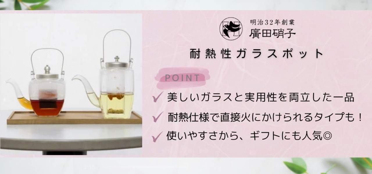 廣田硝子の耐熱性ガラスポットは、日本製の手仕事でガラスも美しく使いやすいティーポットです。耐熱仕様で直接火にかけられるタイプもあり、毎日のティータイムを上質に演出してくれますよ。
