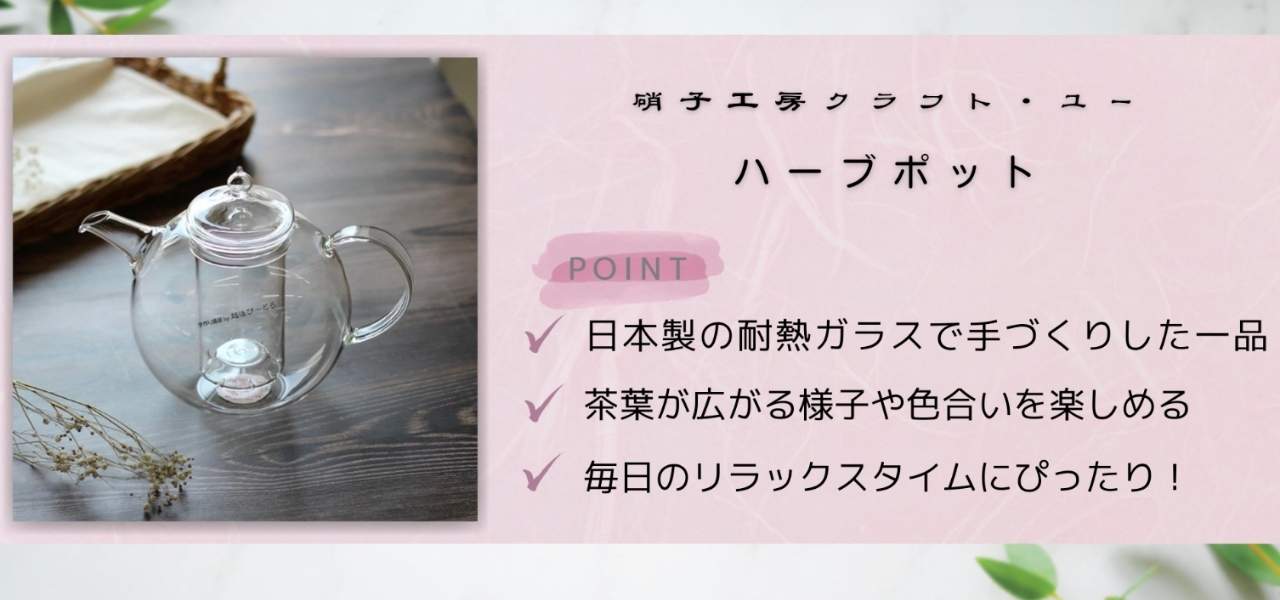 硝子工房クラフト・ユーのハーブポットは、日本製の耐熱ガラスで手づくりしたティーポットです。丸みのあるフォルムと透明なガラスは、茶葉が広がる様子や色合いを楽しめるのが魅力。