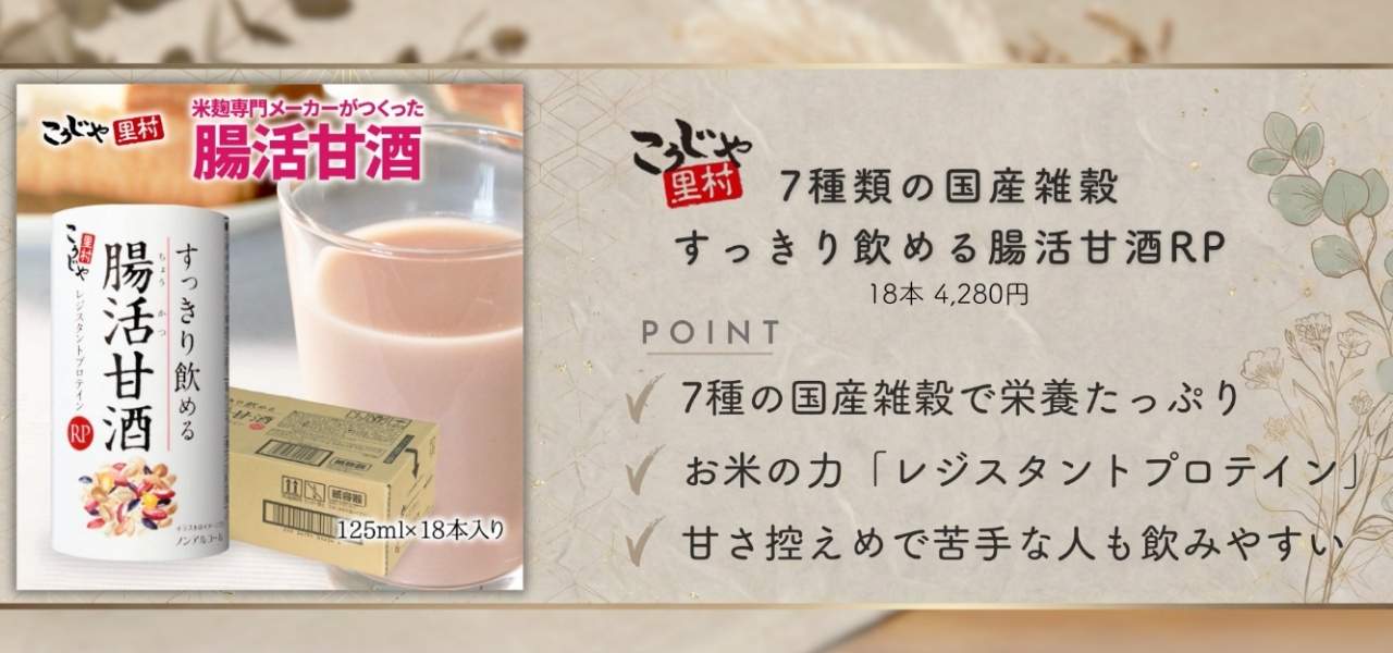 こうじや里村のおすすめのアイテムは「7種類の国産雑穀 すっきり飲める腸活甘酒RP」です。