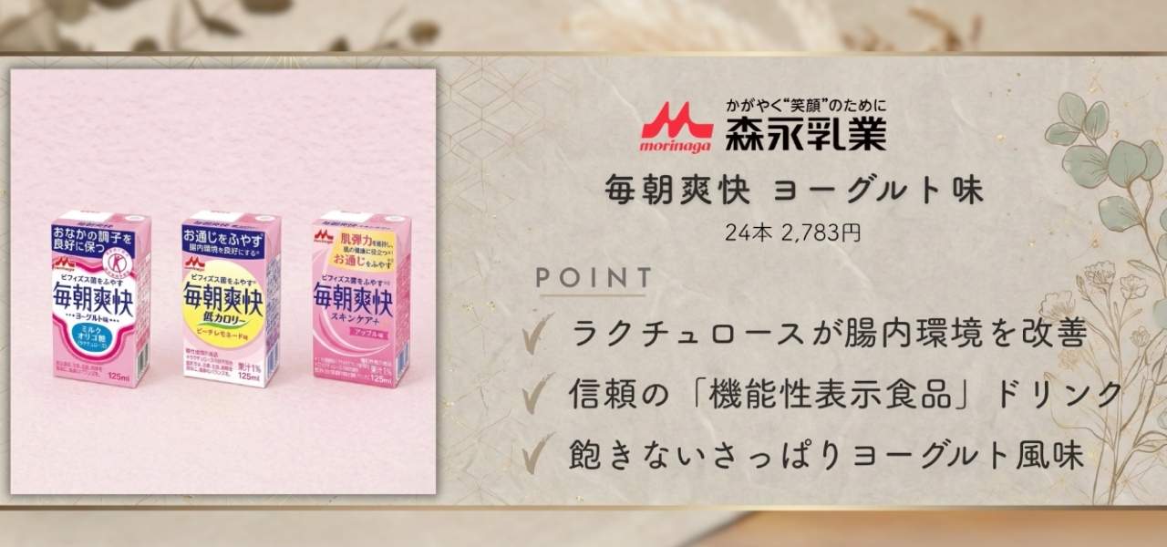 森永乳業のおすすめのアイテムは「毎朝爽快 ヨーグルト味」です。