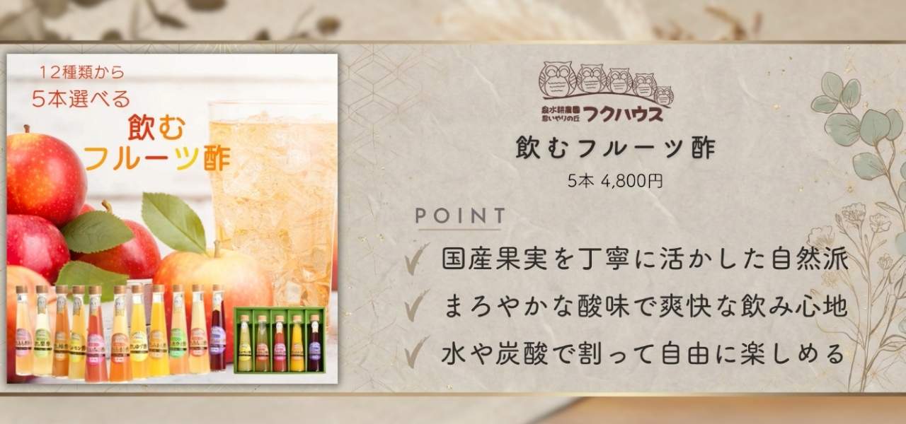 泉水耕農園思いやりの丘フクハウスのおすすめのアイテムは「飲むフルーツ酢」です。
