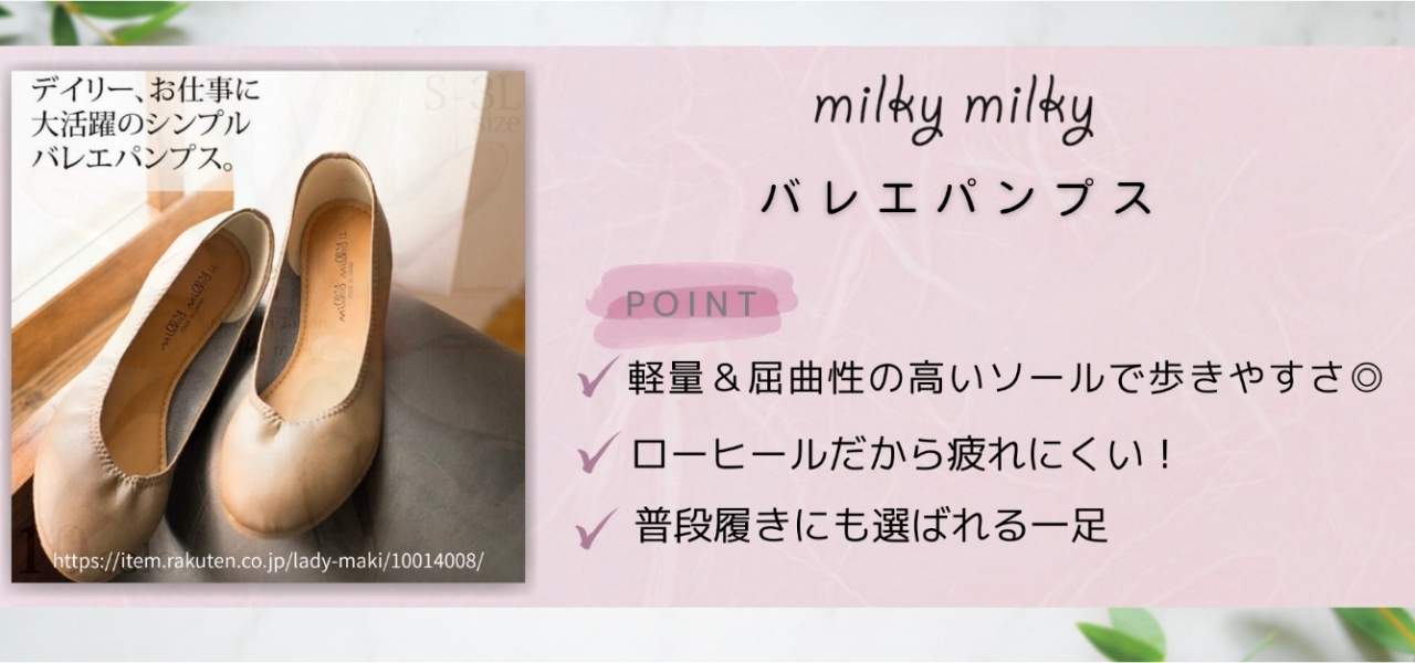 5つめは、日本製のシューズブランドで、パンプスやバレエシューズ、カジュアル靴などが人気のミルキーミルキーです。柔らかい素材と軽さを重視した設計で、足に優しく快適な履き心地。