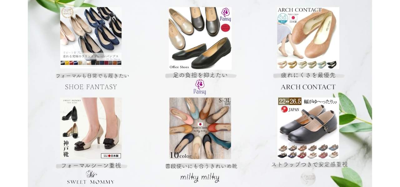1つめは、神戸のシューズメーカーが手掛ける日本のレディースシューズブランドのShoe fantasyです。履き心地の良さや歩きやすさにこだわり、幅広・外反母趾の方にも優しい設計で、フォーマルな場面から普段使いまで、きれいめデザインの靴が揃っています。機能性と上品さを両立しています。