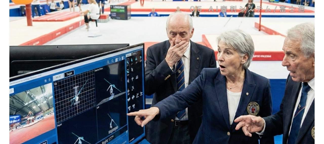 体操競技は、人間の目では追いきれないほどの高速回転や複雑な動きが連続します。そこで「公平な採点」を求めて導入されたのが、富士通の3Dセンシング技術を用いたAI審判システムです。