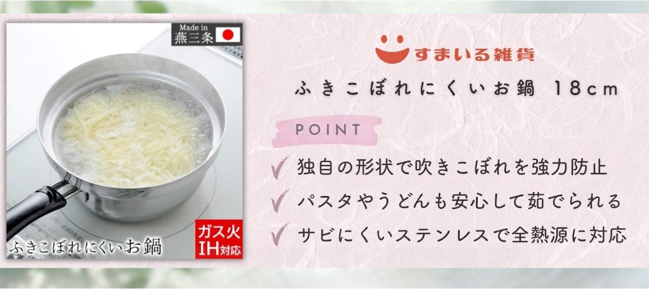 すまいる雑貨のおすすめは「ふきこぼれにくいお鍋 18cm」です。