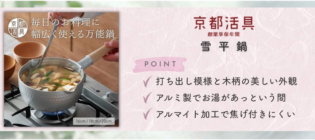1つめは、京都の職人が手がける「京都活具」です。京都活具は見た目の美しさと機能性のバランスが秀逸。特に雪平鍋は、アルミの熱伝導の良さをそのまま活かしながら、表面にアルマイト加工を施すことで、焦げ付きにくく耐久性も高いです。
