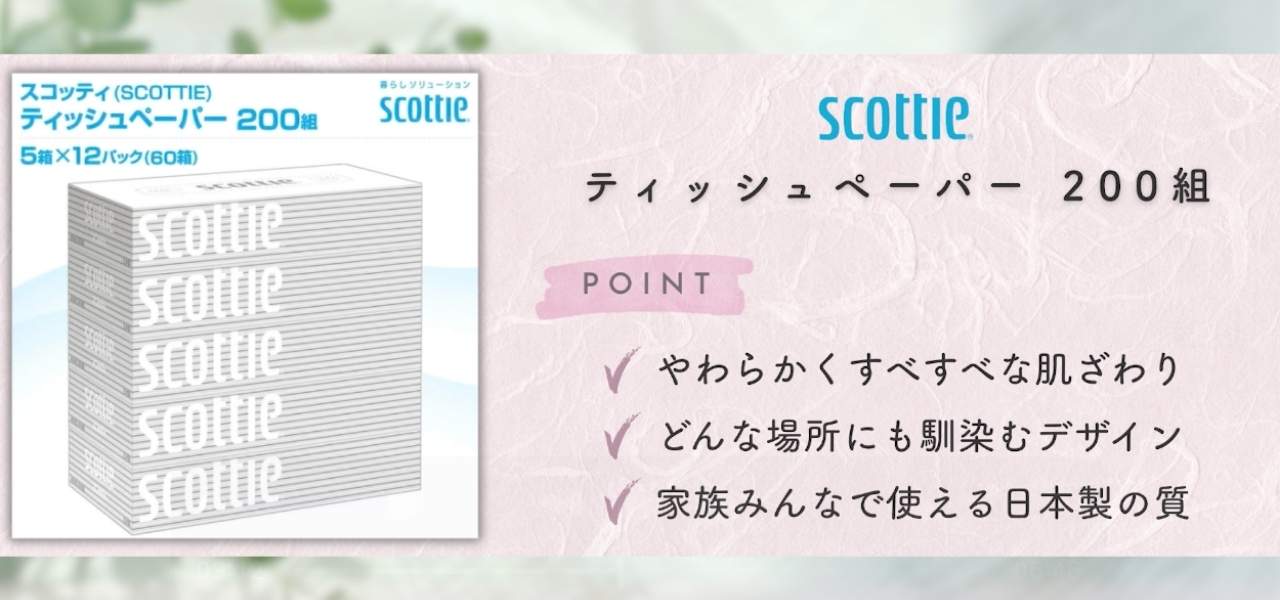 日本製紙クレシア(スコッティ)のおすすめは、「ティッシュペーパー 200組」です。