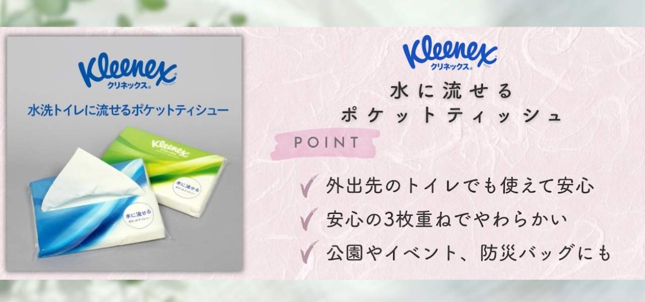 クリネックスのおすすめは、「水に流せる ポケットティッシュ」です。